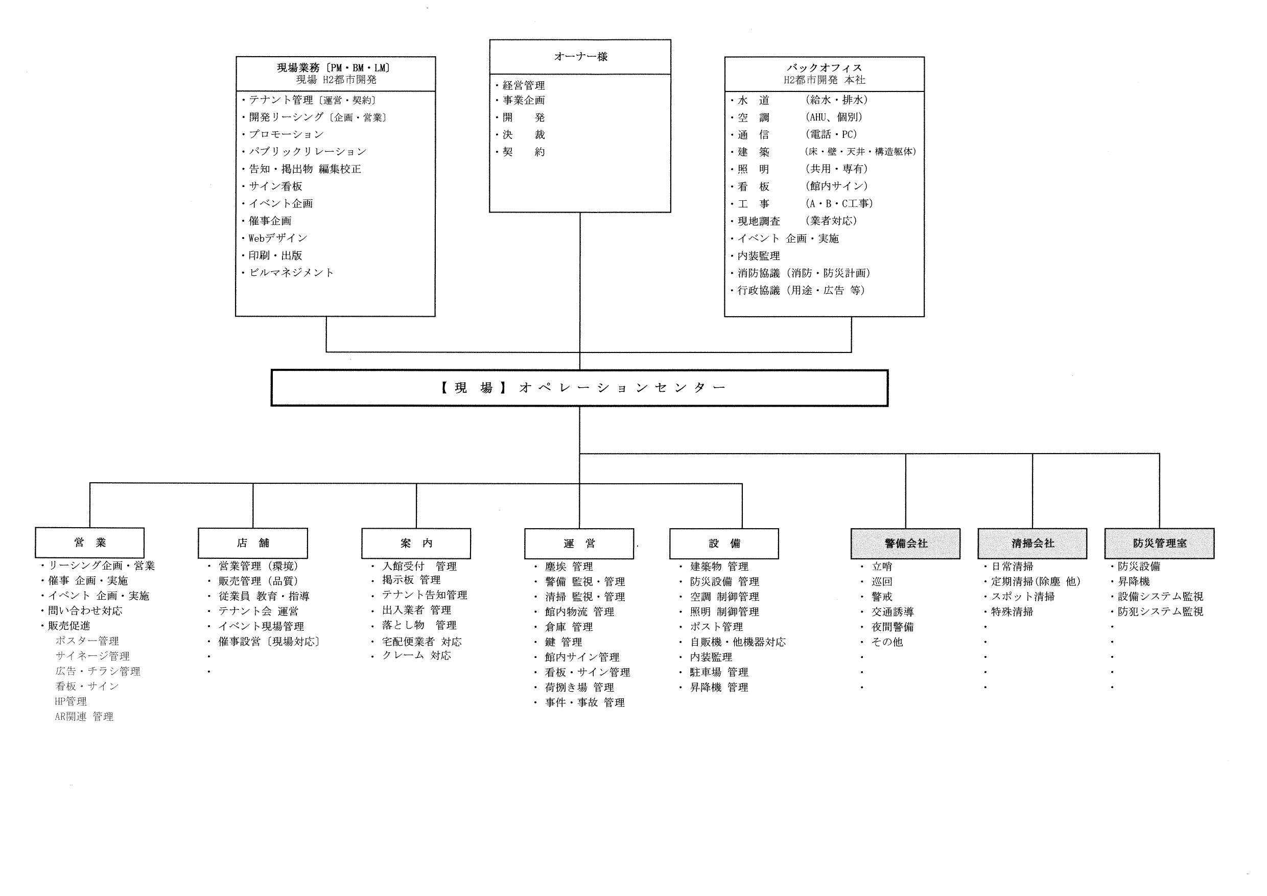 (1)プロパティマネジメント業務 不動産に関するコンサルティング業務、不動産仲介業務、店舗開発・運営業務、リーシング業務、催事企画・編集・運営業務、貸ホール・貸会議室の運営管理、イベントの企画・制作、不動産賃貸借業 (2)商業施設オペレーション業務 テナント管理業務、販売促進業務、イベント・キャンペーン企画・運営業務、催事企画・運営業務、売上金管理業務 (3)デザイン・設計・施工業務 商環境・店舗デザイン、建築設計業務、設備設計業務、内装監理(内監)業務、工事管理業務 (4)ビル管理・メンテナンス業務 設備管理業務、物流管理業務、清掃業務などの管理 (5)イベント・催事の企画・運営業務 企画立案、誘致営業、設営、運営事務含む |